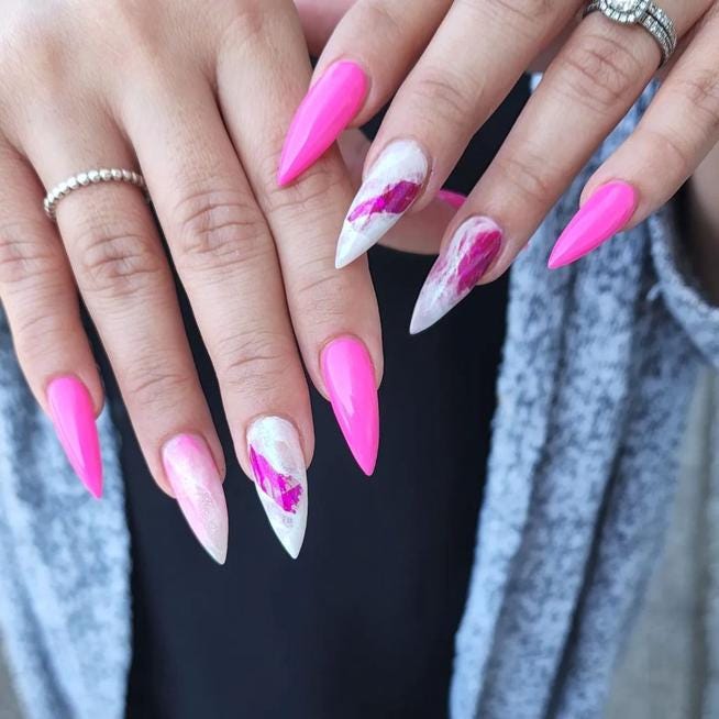 These pink and white marble nails are a vibrant and playful option for those who love bright colors. The hot pink base is accented with white marbling and subtle hints of metallic pink, creating a fun and eye-catching design. This look is ideal for summer and can be achieved with gel polish. The sharp, pointed shape adds an edgy twist to this otherwise playful design.